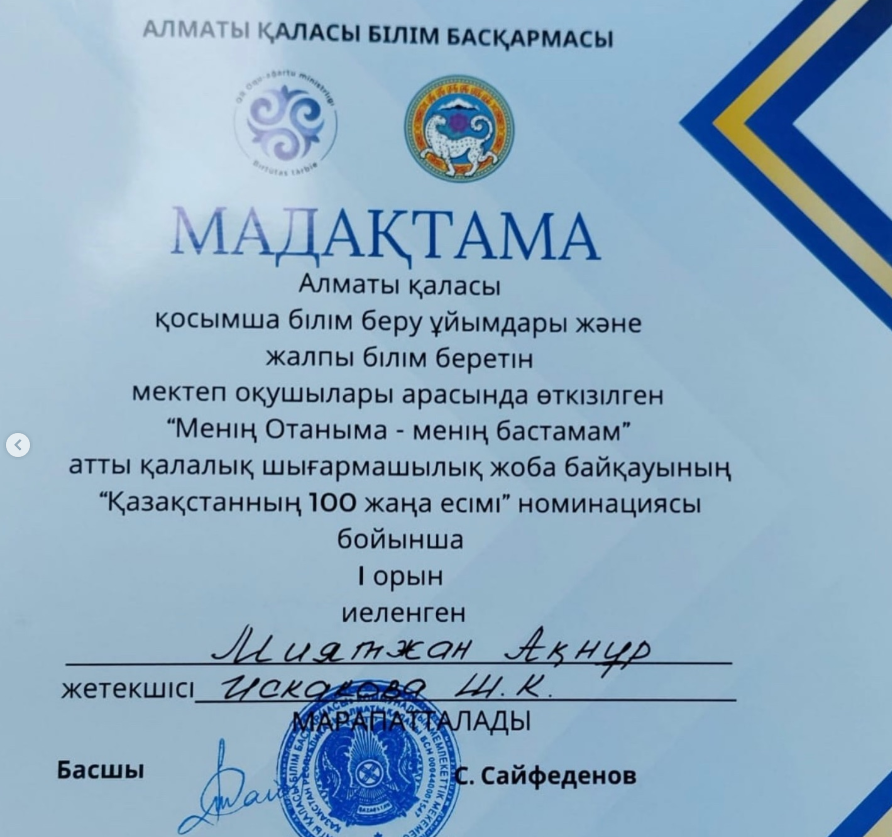 Алматы қаласы қосымша білім беру ұйымдары және жалпы білім беретін мектеп оқушылары арасында өткізілген “Менің Отаныма - менің бастамам” атты қалалық шығармашылық жоба байқауының “Қазақстанның 100 жаңа есімі” номинациясы бойынша тарих пәнінің мұғалімі Искакова Шынар Кенесбековнаның жетекшілігімен 1-орынды иеленген 11 “В” сынып оқушысы Миятжан Ақнұр Алматы қаласы Білім басқармасының мадақтама қағазымен марапатталды.