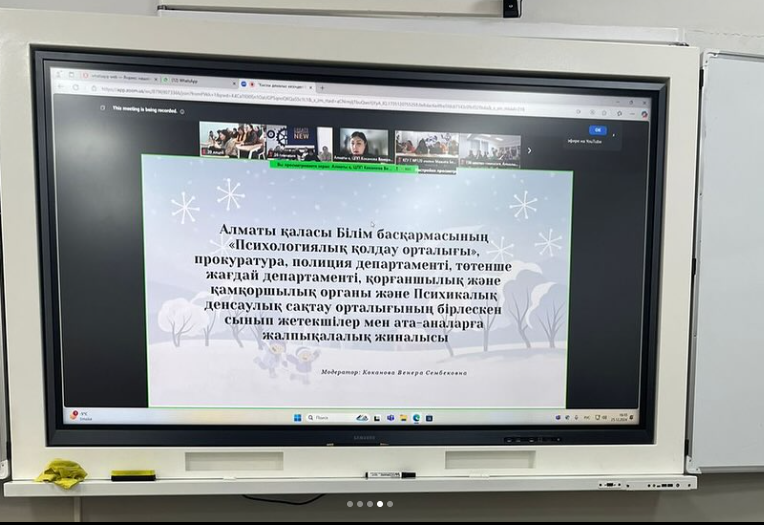Бүгін Алматы қаласы прокуратурасы, Полиция департаменті және Психикалық денсаулық сақтау орталықтарымен бірлесіп "Қысқы демалыс кезіндегі бала қауіпсіздігін қамтамасыз ету" тақырыбында онлайн жалпықалалық сынып жетекшілер жиналысы өткізілді.
