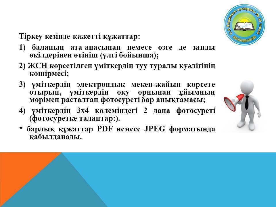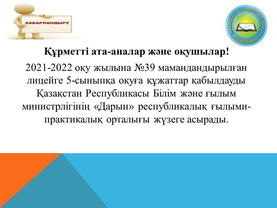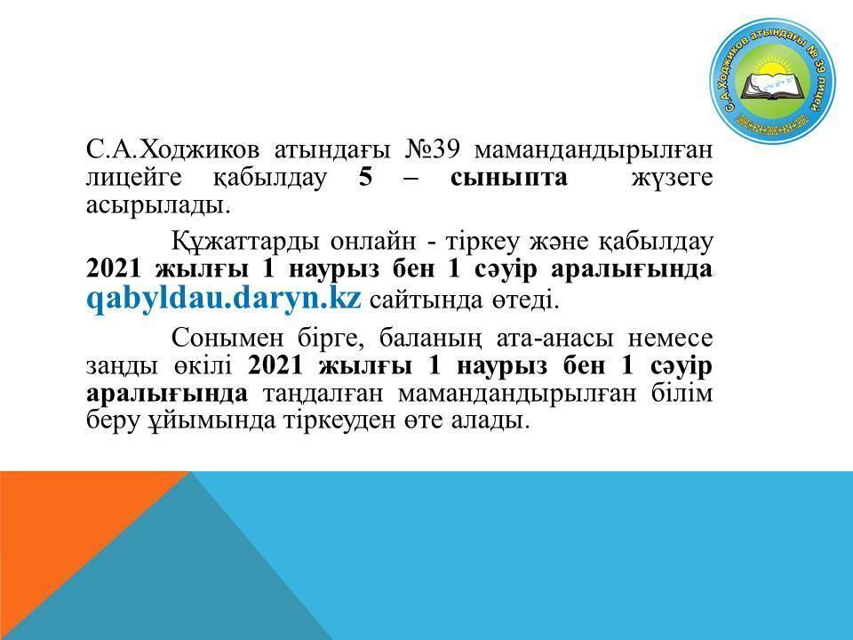 Қайырлы күн құрметті ата-аналар!!!Мамандандырылған лицейлерге қабылдау талаптары өзгерді. №39 мамандандырылған лицейге 5 сыныпқа қабылдау үшін өтініштер 2021 жылдың 1 наурызы мен 1 сәуірі аралығында онлайн қабылданады.