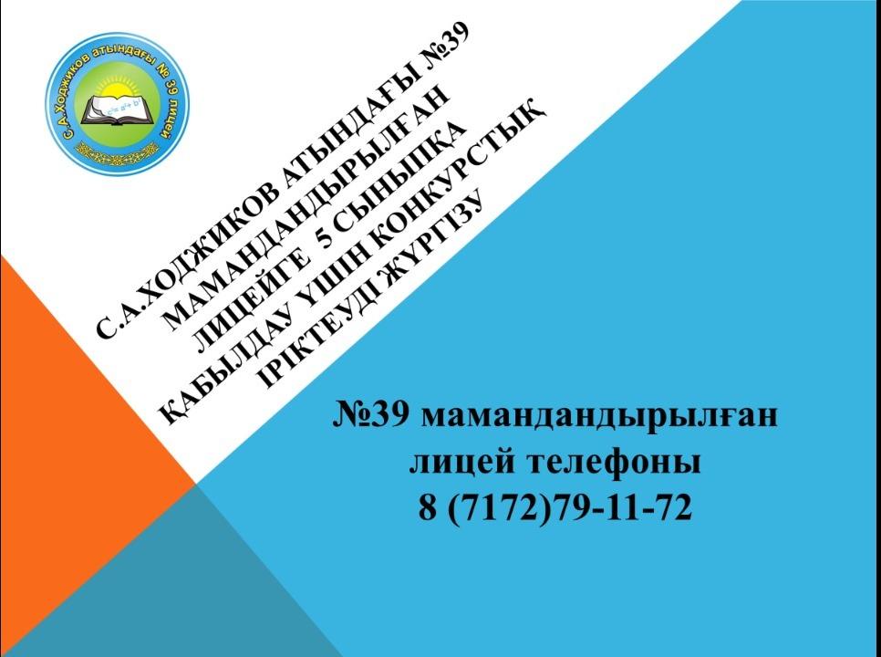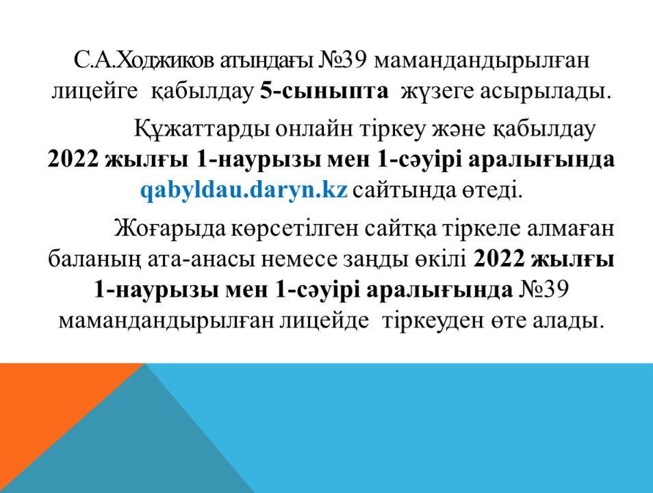 Мамандандырылған лицейлерге қабылдау талаптары өзгерді. С.А. Ходжиков атындағы №39 мамандандырылған лицейіне 5- сыныпқа қабылдау үшін өтініштері 2022 жылдың 1-наурызынан 1-сәуіріне дейін созылды. Құжаттар онлайн қабылданады. Конкурстық іріктеу 1-20 МАУСЫМ (июнь) айының аралығында өтеді.