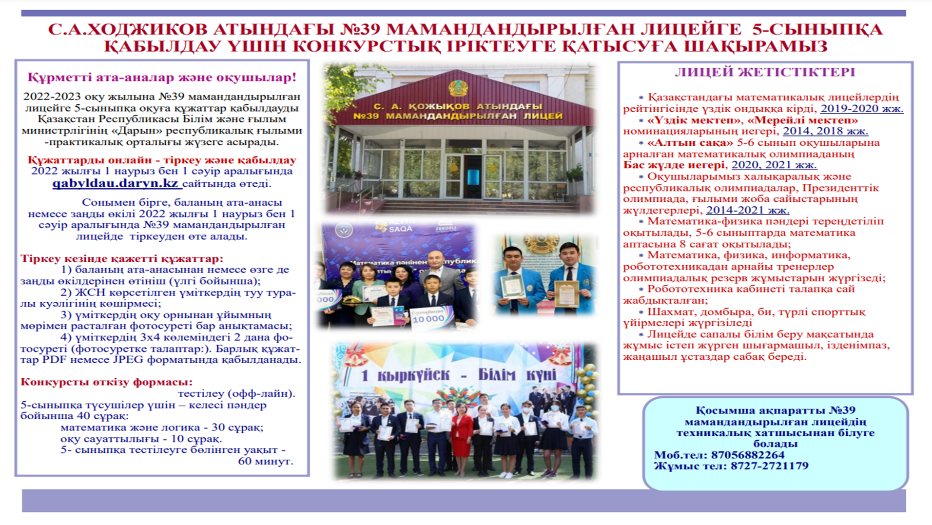 №39 мамандандырылған лицейге 5 сыныпқа қабылдау үшін өтініштер