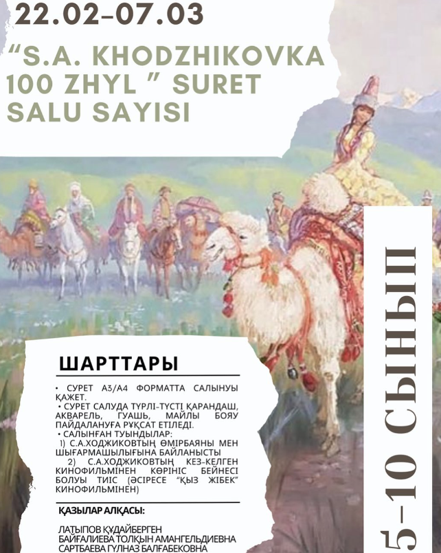 Сіздерге С.А.Ходжиковтың 100-жылдық мерейтойына арналған сурет көрмесінің болатынын хабарлаймыз.