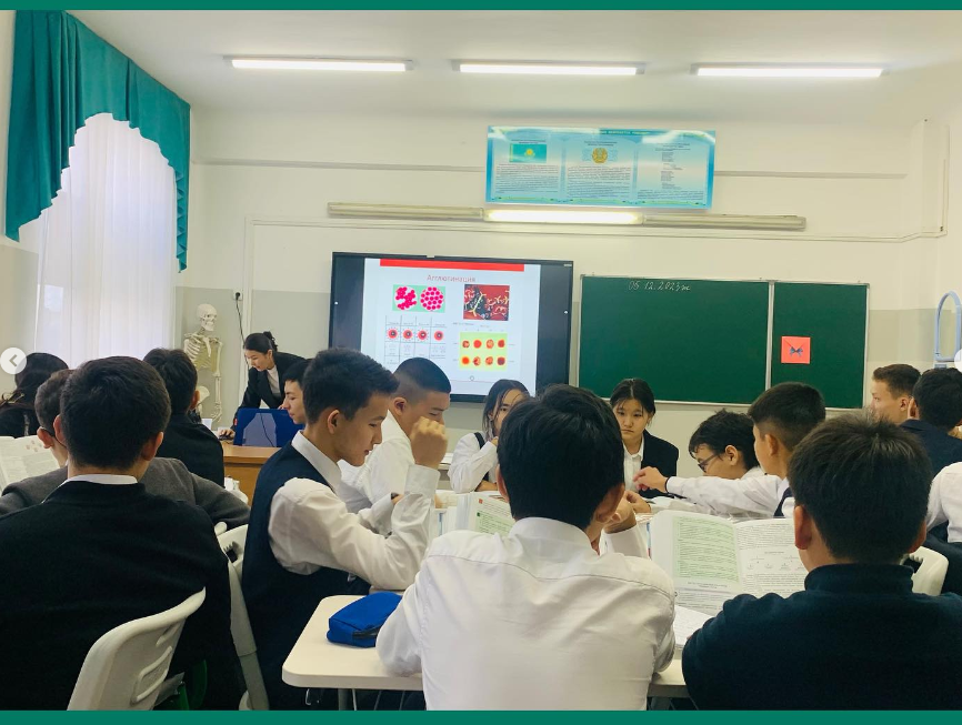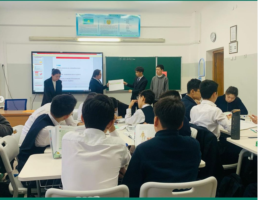 “Ғылыми-жаратылыстану пәндер мұғалімдері” кафедрасының “Ашық сабақтар айлығы” аясында биология мұғалімі Әбілдаева А.Н. “Буылтық құрттардың (жауын құрты), ұлулардың, буынаяқтылардың және омыртқалардың жүрегі және қан тамырларының құрылысы мен қызметі” тақырыбында 05.12 күні 8 “В” сыныбымен ашық сабақ өткізді. Сабақты ұйымдастыруда оқушылардың психологиялық жағымды орта қалыптастыруда “Комплимент” әдісін ұтымды қолданды. “Flippity” әдісімен сыныпты 3-топқа бөлді: “Тапқырлар”, “Алғырлар”, “Зеректер”. Өткен сабақты қайталауда 3-топқа 3 түрлі сұрақ қойылып, оқушылар белсенді жауап берді. Жаңа сабаққа кіріспе ретінде “Көзбен көретін айғақтармен жұмыс” айдарымен сұрақ-жауап арқылы жаңа сабаққа сілтеме жасалды. Сабақ барысы презентация материалдары арқылы өткізілді. Бейнекөрініс көрсетіліп, рөлдік ойын негізінде оқушылар оқулық т.б. қосымша материалдармен әр топ оқушылары өздеріне берілген тапсырмаларына сай iзденіс жұмыстарын жүргізді. Сабақ соңында БББ әдісімен рефлексия жасалып, сабақ барысы қорытындыланды.