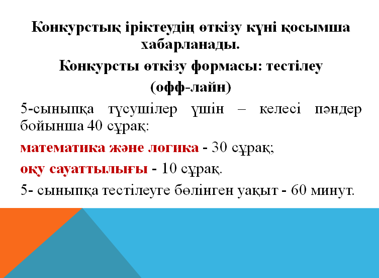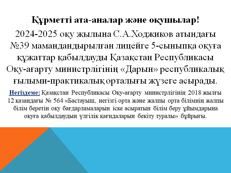 05 ақпан 2024 100 1 2 3 4 5 С.А.Ходжиков атындағы №39 мамандандырылған лицейге 2024-2025 оқу жылана 5-сыныптарды қабылдау