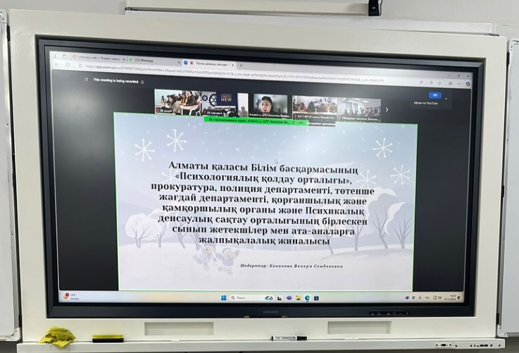 Бүгін Алматы қаласы прокуратурасы, Полиция департаменті және Психикалық денсаулық сақтау орталықтарымен бірлесіп "Қысқы демалыс кезіндегі бала қауіпсіздігін қамтамасыз ету" тақырыбында онлайн жалпықалалық сынып жетекшілер жиналысы өткізілді.