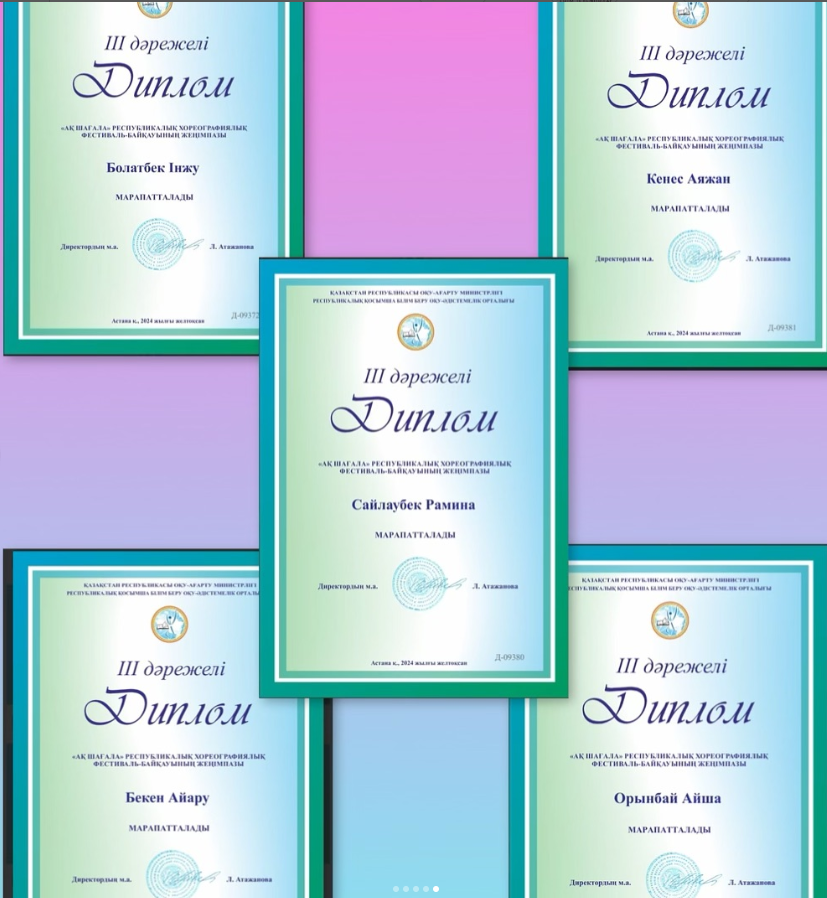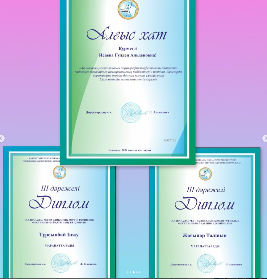 “Би” үйірмесінің жетекшісі Исаева Гулден Альденовнаның биші оқушылар тобы “Ақ шағала” республикалық хореографиялық Фестиваль байқауында 3-орынды иеленді. Құттықтаймыз