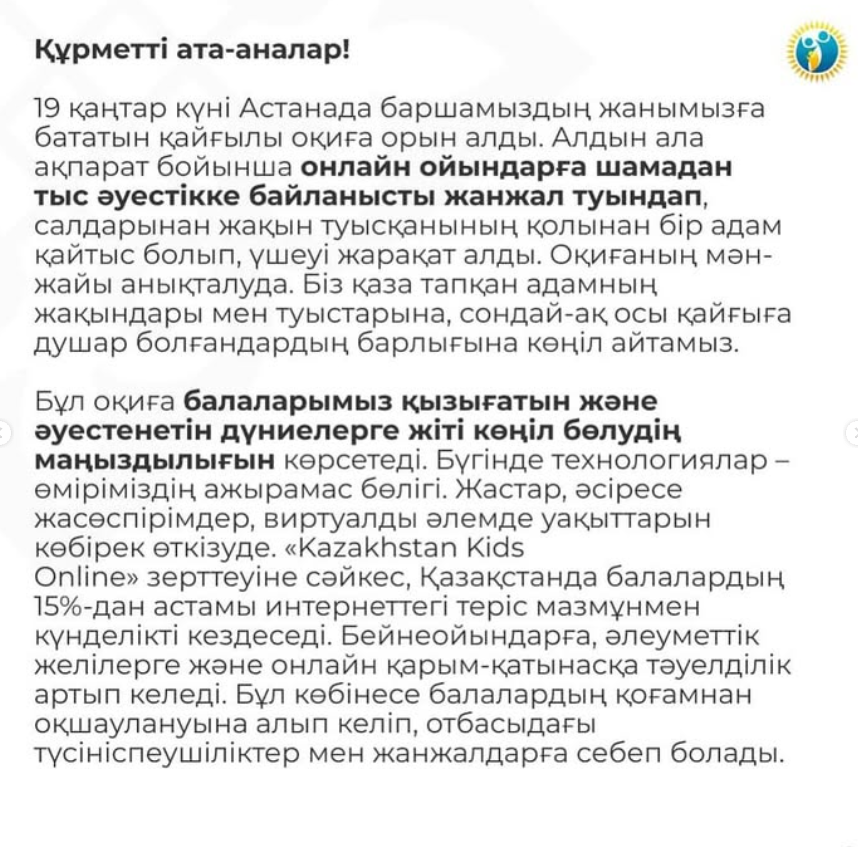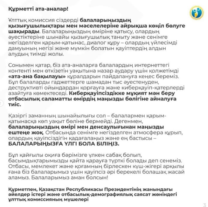 ҚАЗАҚСТАН РЕСПУБЛИКАСЫ ПРЕЗИДЕНТІ ЖАНЫНДАҒЫ ӘЙЕЛДЕР ІСТЕРІ ЖӘНЕ ОТБАСЫЛЫҚ-ДЕМОГРАФИЯЛЫҚ САЯСАТ ЖӨНІНДЕГІ ҰЛТТЫҚ КОМИССИЯНЫҢ МҮШЕЛЕРІНЕН АТА-АНАЛАР ҚАУЫМЫНА ҮНДЕУ