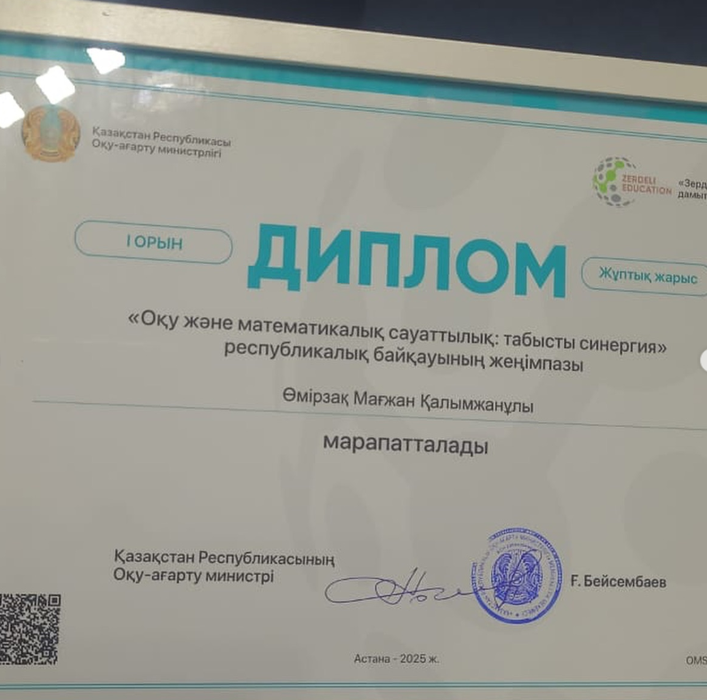 Астана қаласында өткен “Оқу және математикалық сауаттылық: табысты синергия” Республикалық байқауда ұстазымыз 1-дәрежелі дипломмен марапатталды