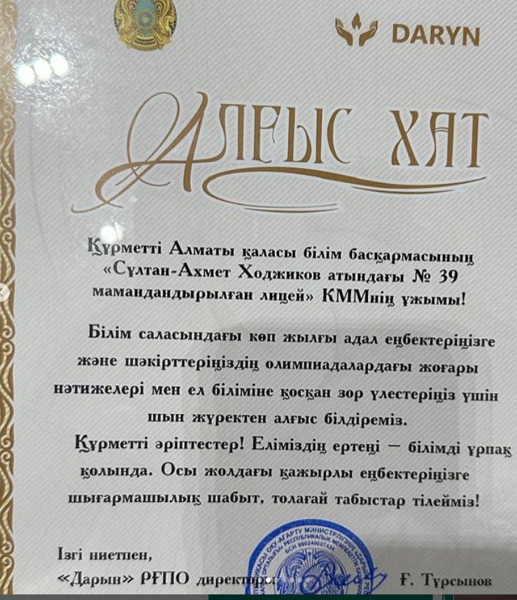 Сонымен қатар, лицей ұжымы Білім саласындағы көп жылғы адал еңбектері және шәкірттерінің олимпиадалардағы жоғары нәтижелері мен ел біліміне қосқан зор үлестері үшін «Дарын» республикалық ғылыми-практикалық орталығының АЛҒЫС ХАТЫМЕН марапатталды!