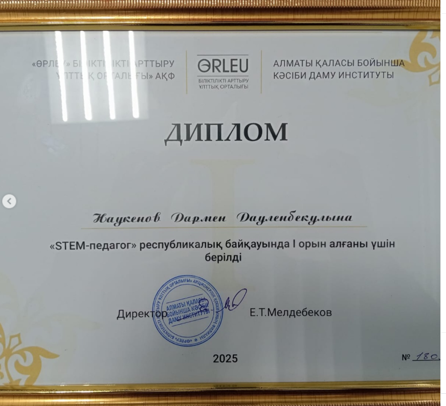 Физика пәнінің мұғалімі Наукенов Дармен Дауленбекулы “Өрлеу” БАҰО” АҚ тарапынан ұйымдастырылған республикалық “STEM педагог” байқауында 1-орынды иеленді!