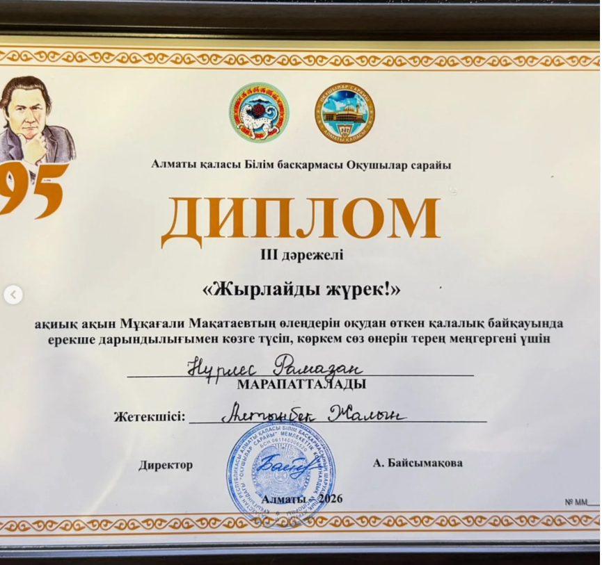 Оқушымызға алдағы уақытта да шығармашылық табыс, биік белестер тілейміз!