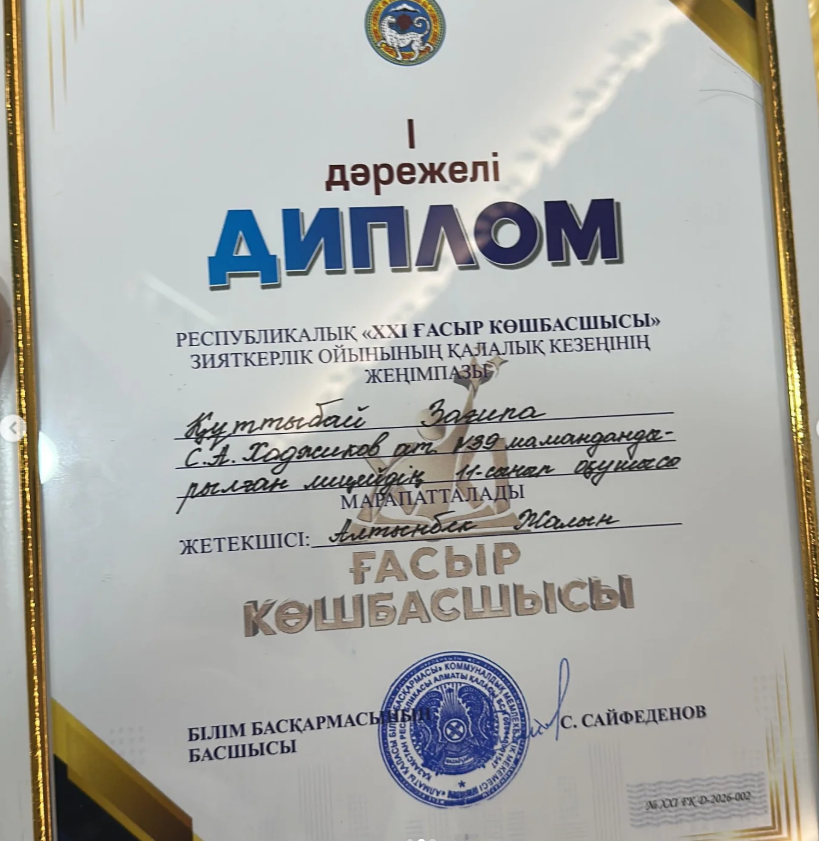 Лицейіміздің 11-сынып оқушысы Құттыбай Зағипа қалалық «21 ғасыр көшбасшысы» зияткерлік сайысында бақ сынап, 84 оқушының арасынан оза шауып, 🥇 І орынды иеленді!