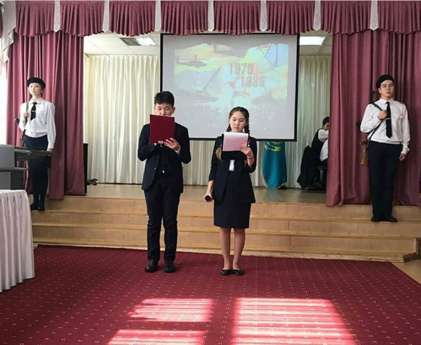 Лицейде 7 "Ә" сыныбының ұйымдастыруымен, Кеңес әскерлерінің Ауған жерінен шығарылғанына 31 жыл толуына орай, "Ауғанның отты жалыны" атты Ауған соғысының ардагерлерімен кездесу кеші өтті. Кездесуге АН-26, АН-12 ұшағының командирі, "Авиация" подполковнигі - Кушербаев Серик Аубакирович, Р-142 байланыс Радиостанциясының лейтенанты - Жақсыбаев Аргинбек Есемханұлы қатысты.