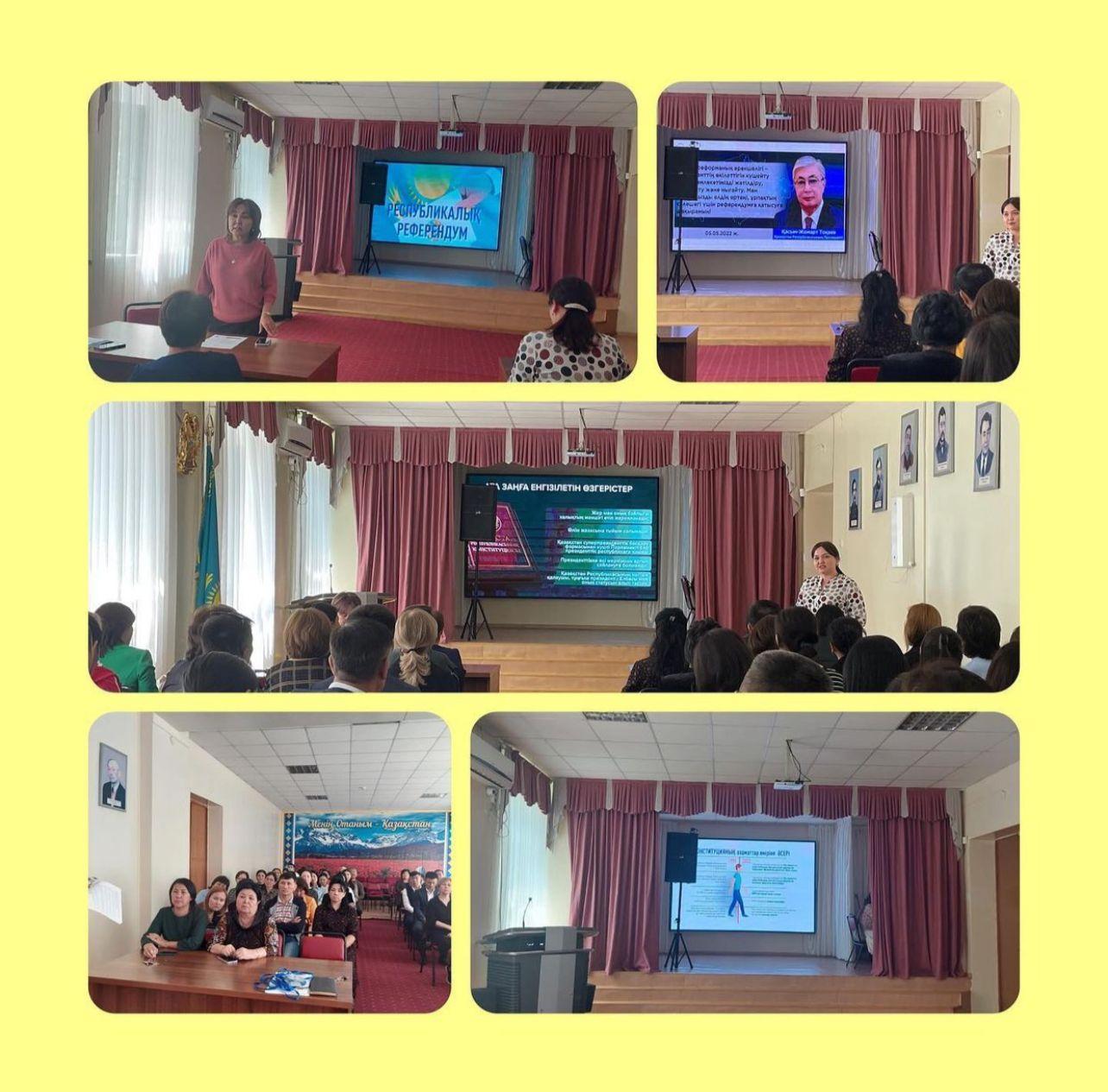 13.05.2022 жылы С.А. Ходжиков атындағы №39 мамандандырылған лицейде әкімшіліктің ұйымдастыруымен "Президенттің ҚР конституциясына өзгертулер мен толықтырулар енгізу туралы референдум" өткізу жайлы жиналыс болып өтті. Жиналыста референдум туралы лицей директоры Маликова Н.Т. және лицей директорының оқу ісі жөніндегі орынбасары Досымбекова М.К. таныстырып өтті.