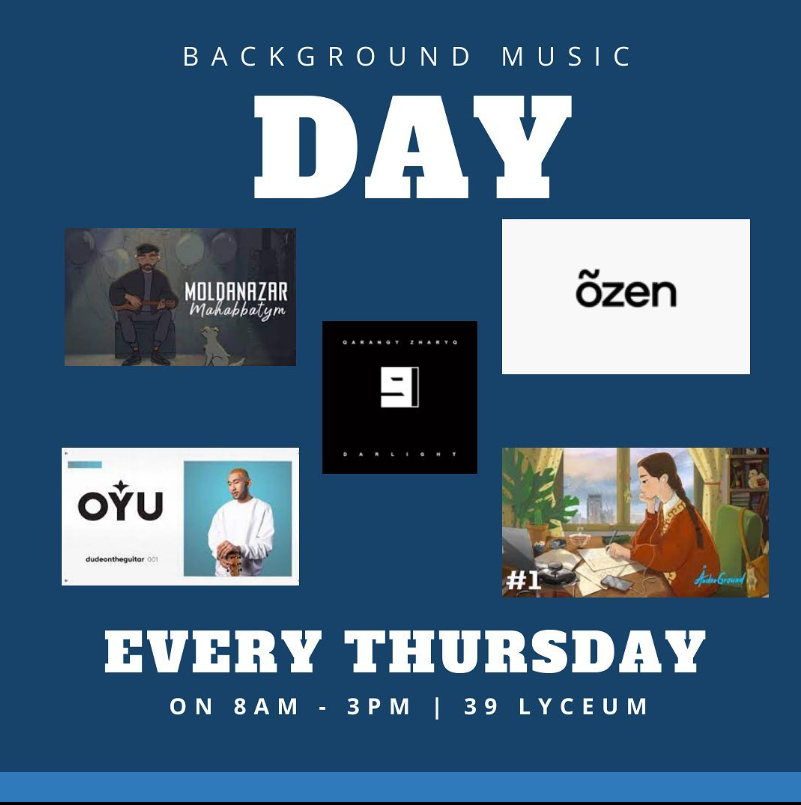 Сіздердің қалауларыңызбен әр бейсенбі біздің мектепте “Әуенді күн”(Musical day) өткізілетін болады.Ол күні әртүрлі қазақша өлеңдерді үзіліс кезінде қосамыз.