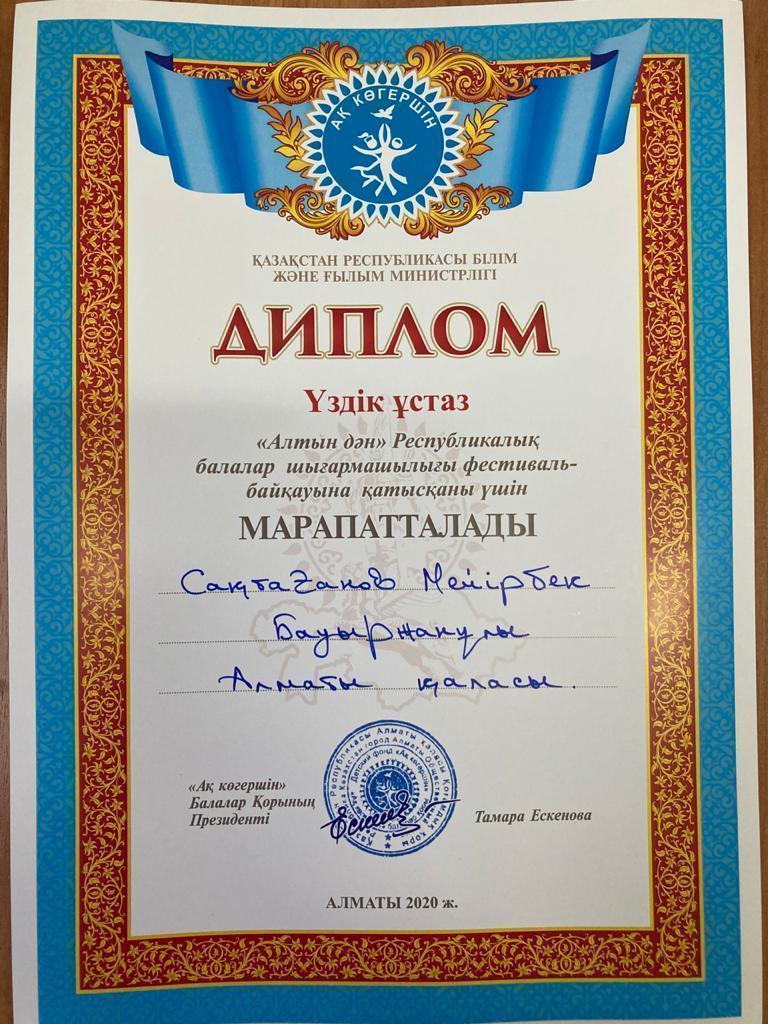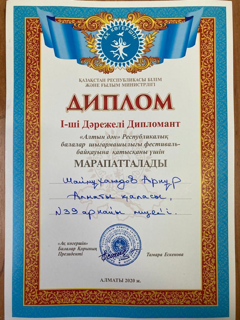Лицейіміздің 5 сынып оқушысы Шаймұхамедов Арнұр "Ақ көгершін" балалар қорының ұйымдастыруымен өткен "Алтын дән" Республикалық балалар шығармашылығы фестиваль-байқауында І дәрежелі дипломант атанып, жеңілдік сертификатына ие болды. "Домбыра" үйірмесінің жетекшісі М.Б.Сақтағанов. Құттықтаймыз!!!!