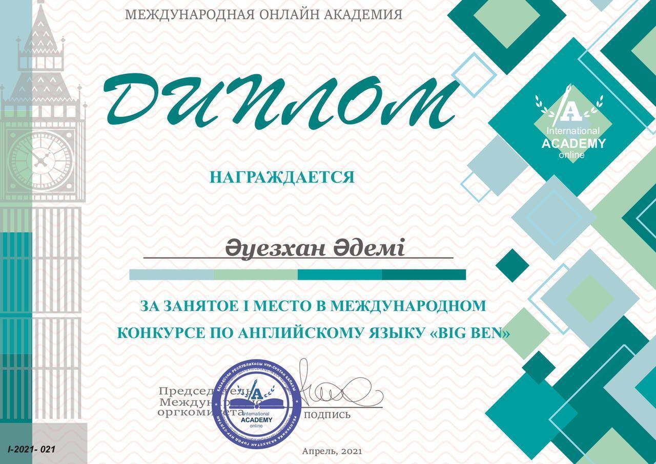"BIG BEN" ағылшын тілінен Халықаралық конкурсқа лицейдің 7 "Ә" сынып оқушысы Асхат Алдияр қатысып (1-орын), пән мұғалімі ағылшын тілі пәнінің мұғалімі Г.С. Санжиева, сондай-ақ 5 "Б" сынып оқушысы Әуезхан Әдемі және 8 " Б" сынып оқушысы Жақсыбайқызы Жанерке 1-орындарды иеленді, пән мұғалімі Ж.Н. Мырзагулова. Марапаттар құтты болсын!!! 👍👏👏👏
