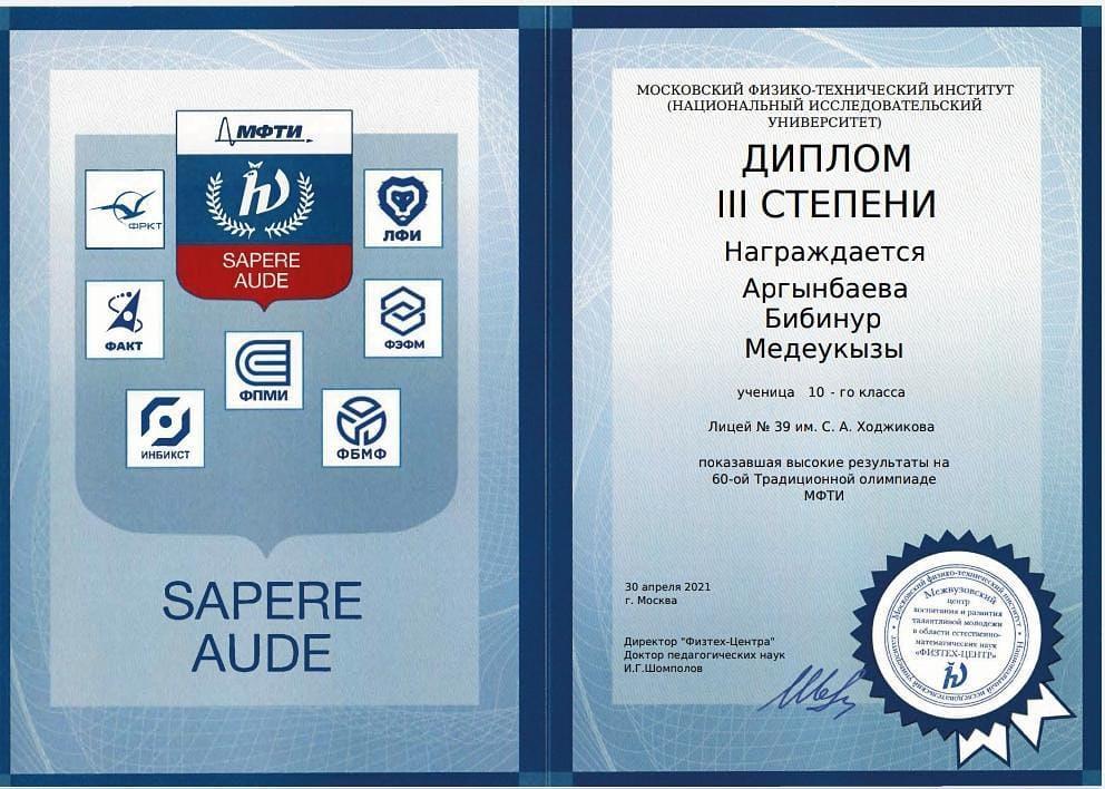 Лицейдің 10 сынып оқушысы Арғынбаева Бибінұр Мәскеу физика-техникалық университетінің 60-шы дәстүрлі олимпиадасына қатысып, 3-орынды иеленді. Жетекшісі, математика пәнінің мұғалімі К.А.Сеитова. Құттықтаймыз!