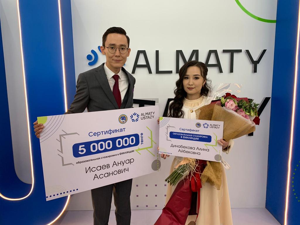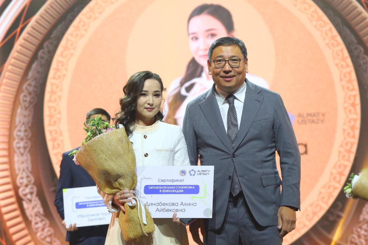 Лицейде тағы да үлкен қуаныш! 01.10 күні Республика сарайында "Алматы ұстазы" байқауының 5 үздік жеңімпаздарын салтанатты түрде марапаттау іс-шарасы өткізіліп, мұғалімдер күнімен тұспа-тұс келген концертпен ұласты. Осы байқаудың 3 кезеңінен өтіп, ерекше марапат пен құрметке ие болған қазақ тілі мен әдебиет пәнінің мұғалімі Динабекова Алина Айбекқызы. Өркениетті елдердің бірі, білім саласы жоғары дәрежеде дамыған Финляндия еліне білім беру тәжірибесінен өтуге Алматы қаласының әкімі Ерболат Асарбекович Досаев арнайы СЕРТИФИКАТ табыстады. Алина Айбекқызы, ұжымның атынан құтты болсын дей отырып, нағыз "Ұстаз" деген есімді жоғарыдан ұстап жүруіңізге шын жүректен тілектеспіз. Жеңістеріміз көп болсын!