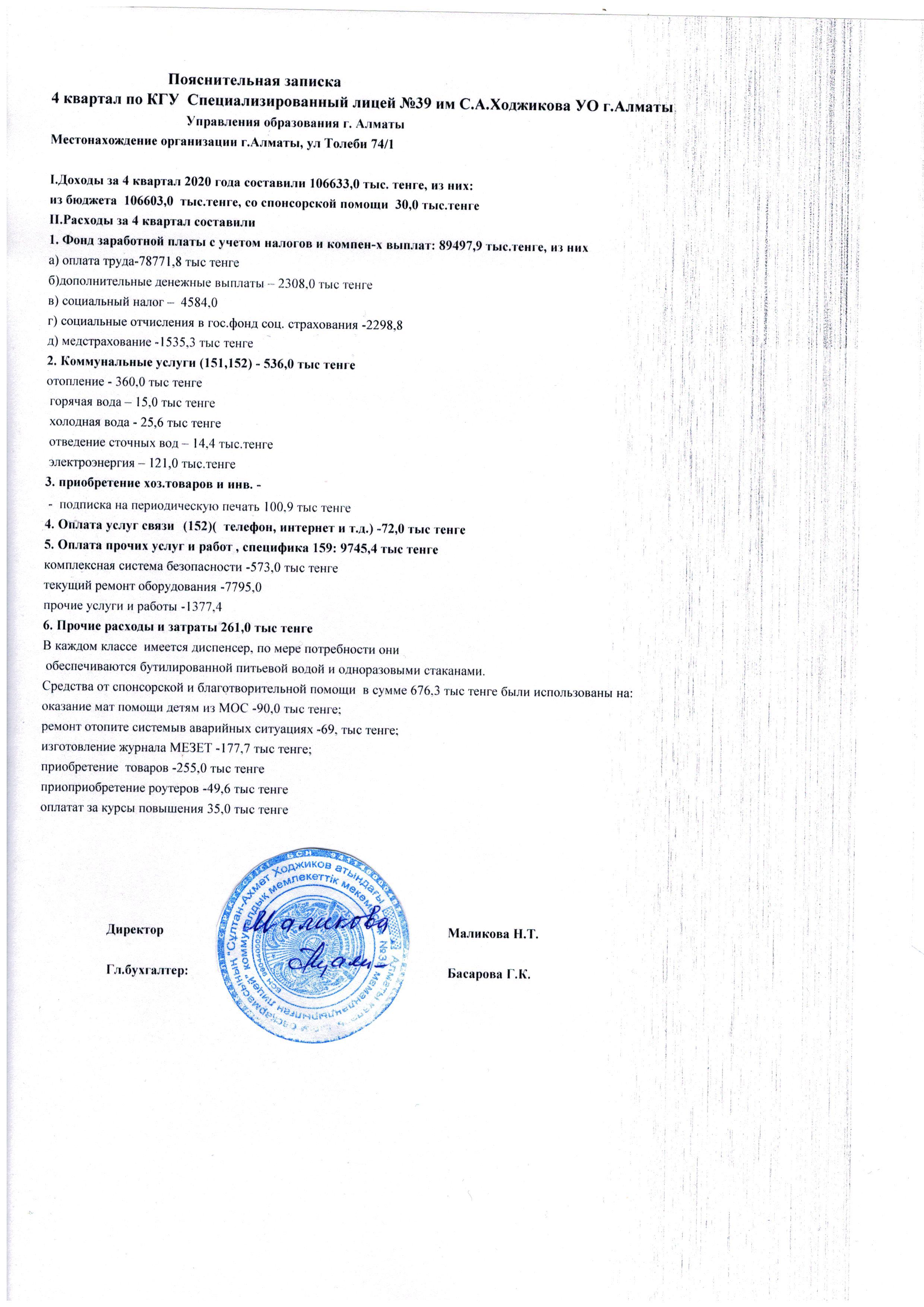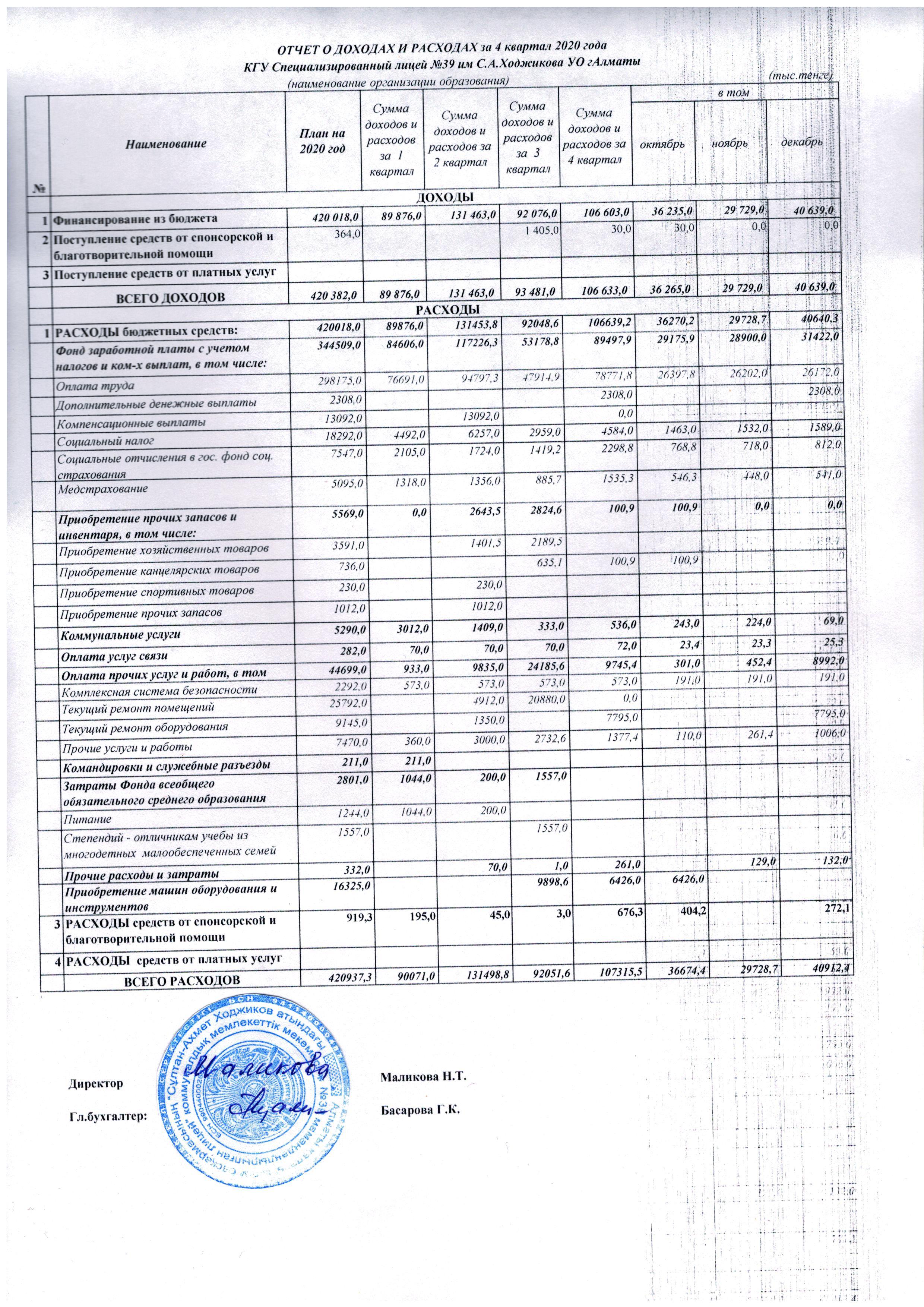 » Отчет о доходах и расходах за 4 квартал 2020г