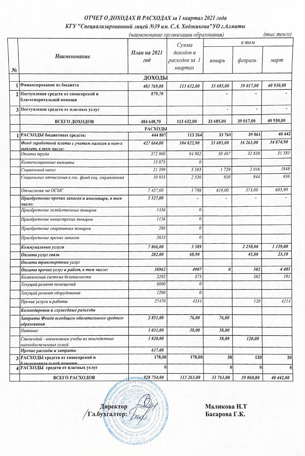 » ОТЧЕТ О ДОХОДАХ И РАСХОДАХ за 1 квартал 2021 года