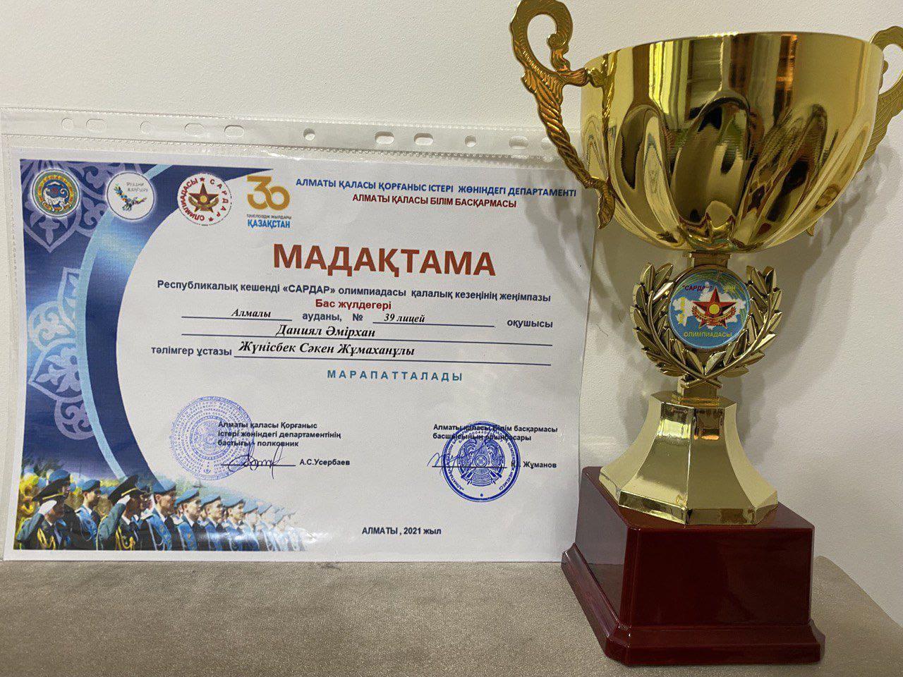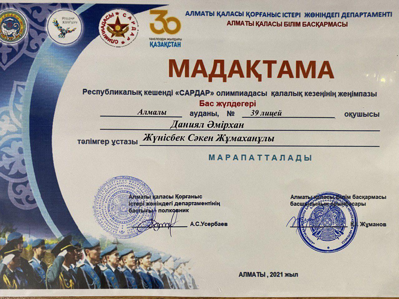 19 мамыр 2021 0 1 2 3 4 5 "Сардар" олимпиадасы 11 А сынып оқушысы Даниал Әмірхан Республикалық кешенді "Сардар" олимпиадасының қалалық кезеңінде үздік нәтиже көрсетіп, БАС жүлдеге ие болды. Жетекшісі Жүнісбек Сәкен Жұмаханұлы. Әмірханды шын жүректен құттықтаймыз!