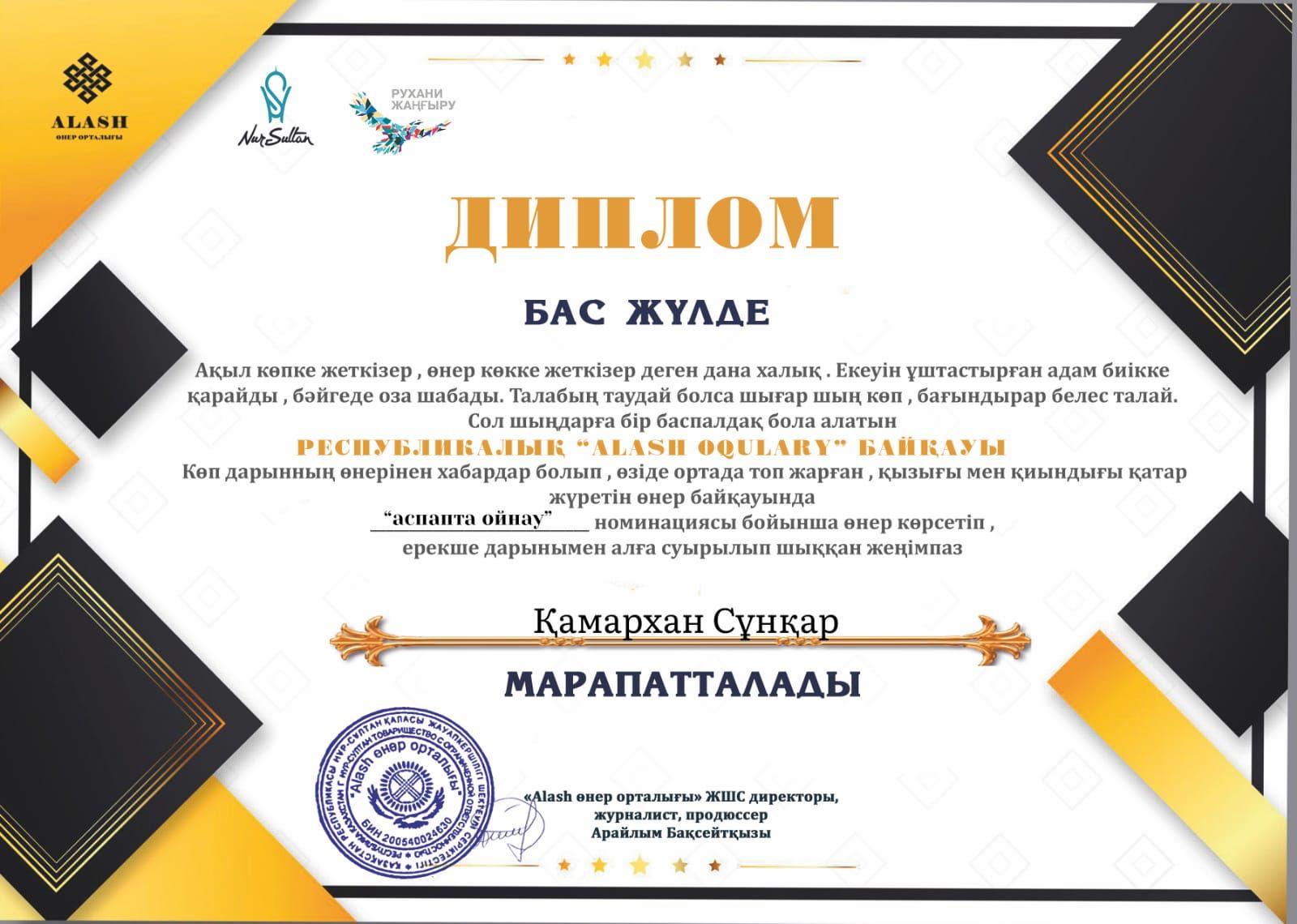 Республикалық “ALASH OQULARY” байқауы көп дарынның өнерінен хабардар болып, өзіде ортада топ жарған, қызығы мен қиындығы қатар жүретін өнер байқауында “аспапта ойнау” номинациясы бойынша өнер көрсетіп, ерекше дарынымен алға суырылып шыққан жеңімпаз 5 “Ә” сынып оқушысы Қамархан Сұңқар БАС ЖҮЛДЕ иегері атанды. Марапат құтты болсын!!!Жеңісті де, жемісті күндеріміз көп болсын!!!🏆🎼