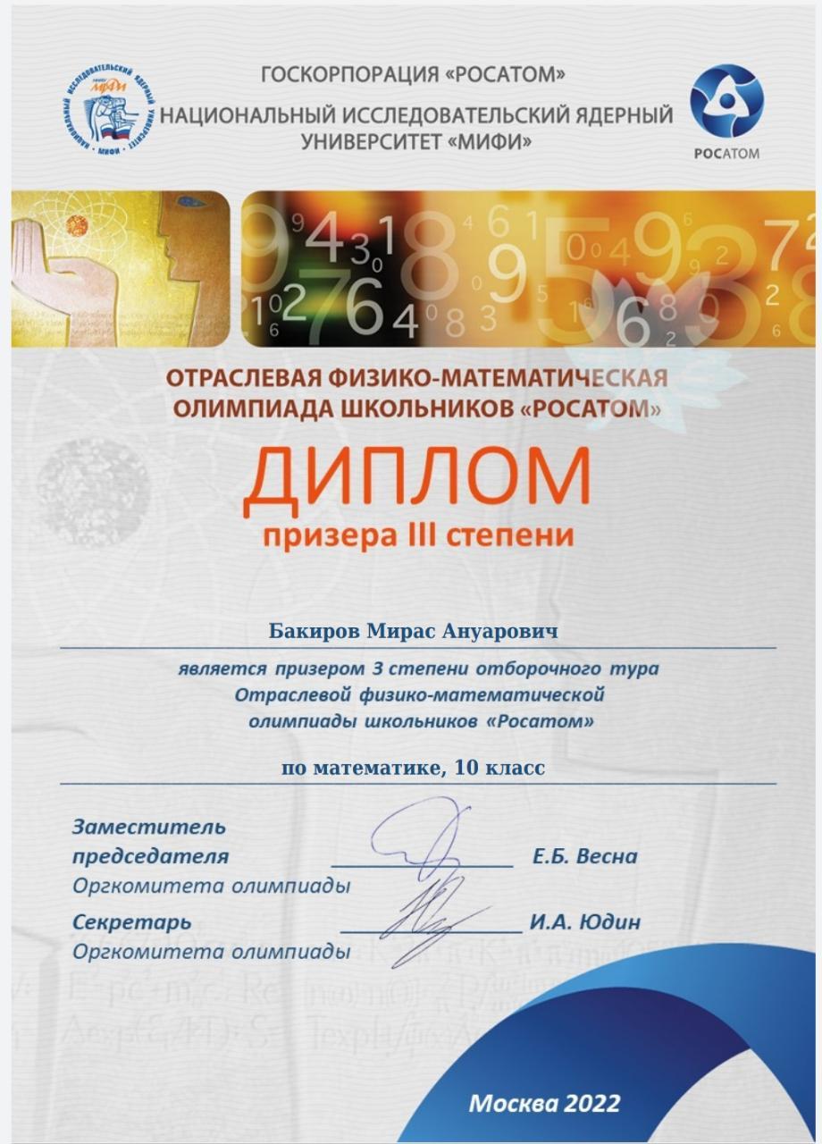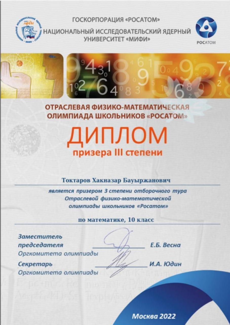 Мәскеу қаласының "МИФИ" Ұлттық ядролык зерттеу университетінің "Росатом" мектеп окушыларының олимпиадасына 10 сынып окушылары Тоқтаров Хақназар, Бакиров Мирас, Рысаков Салават, Бадигул Айторе 3-орындарды иеленіп, ІІІ дәрежелі Дипломмен марапатталды. Жетекші-тренерлері Кабаев М.К., Аскар А. Құттыктаймыз!