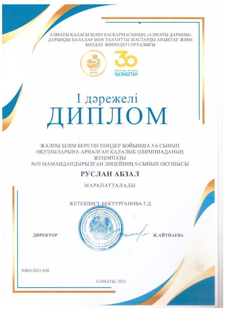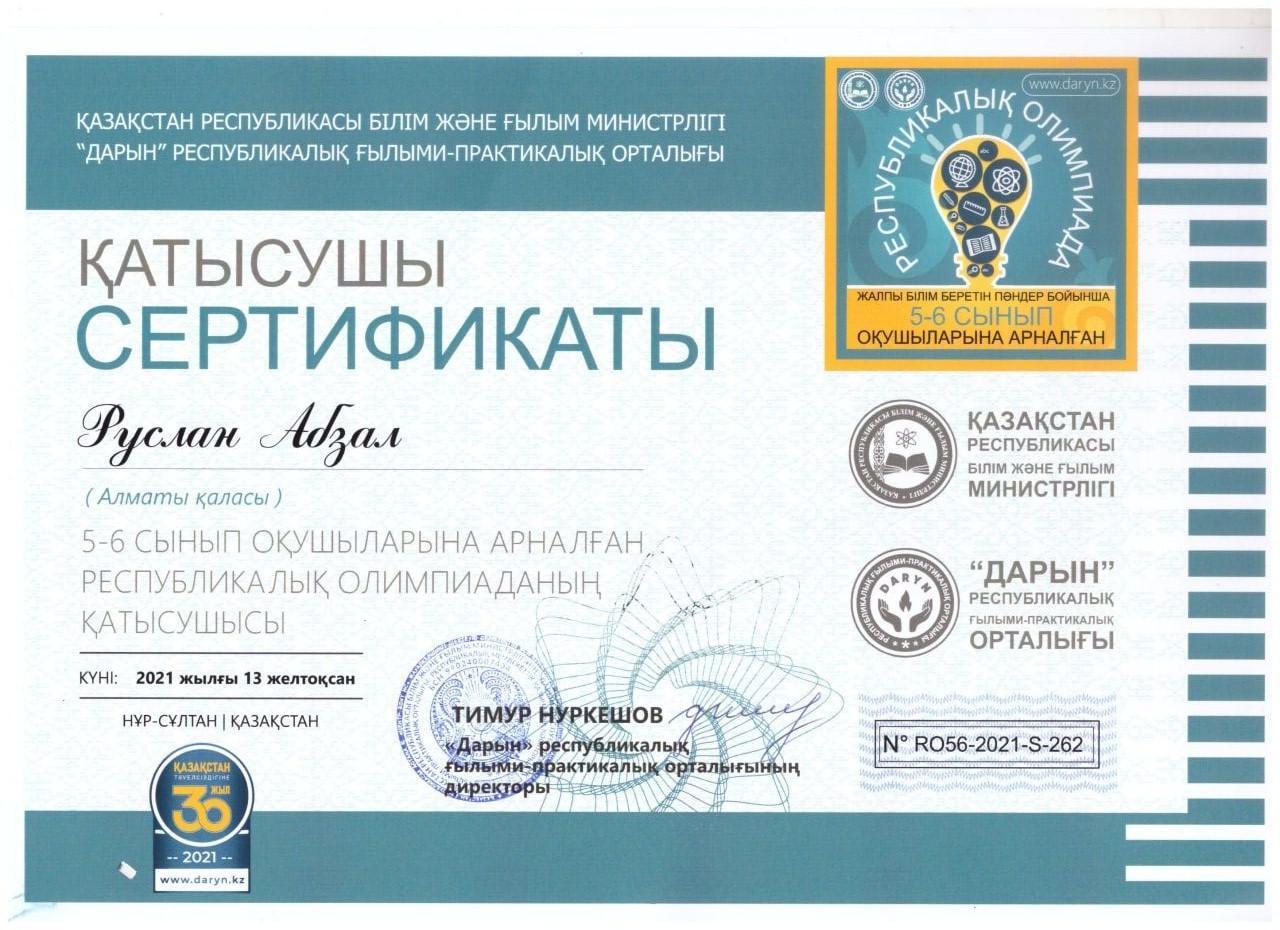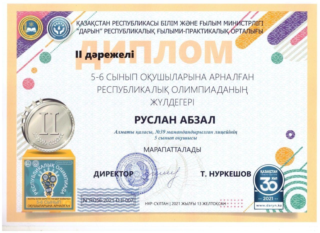 ҚР Білім және ғылым министрлігі “Дарын” республикалық ғылыми - практикалық орталығының 5-6 сынып оқушыларына арналған республикалық олимпиаданың ІІ дәрежелі дипломымен 5 “А” сынып оқушысы Руслан Абзал марапатталды. Жетекшісі: Бектурганова Г.Д. Талантты дарынды оқушыларымыздың жетістігі көп болсын! ҚҰТТЫҚТАЙМЫЗ!!!
