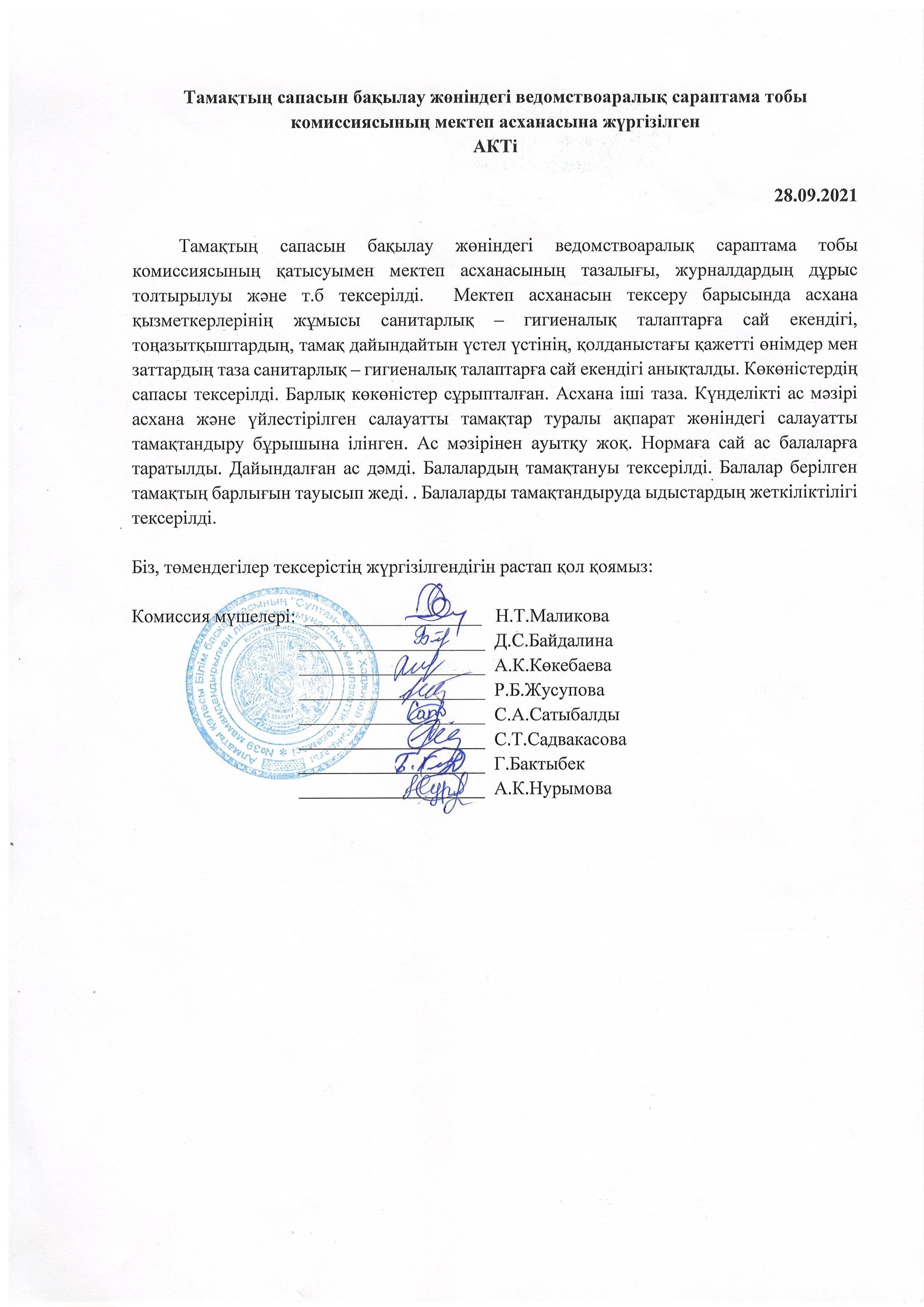» Тамақтану сапасына мониторинг жүргізу актісі