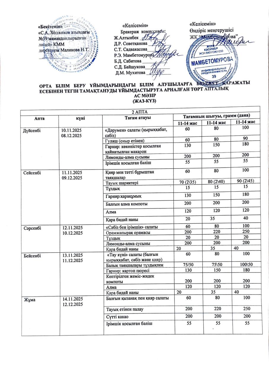 Төрт апталық ас мәзірі II-тоқсан