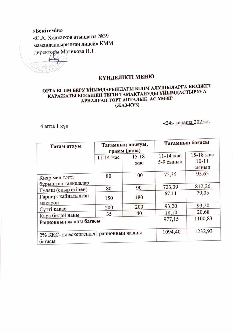 Тамақтануды ұйымдастыру 2025-2026 оқу жылы
