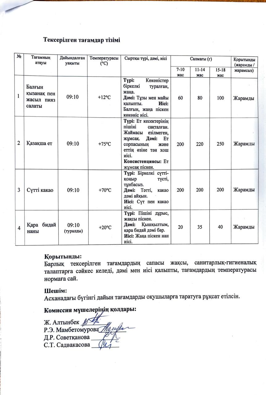 Тамақтың сапасын бақылау жөніндегі ведомствоаралық сараптама тобы комиссиясының 2019-2020 оқу жылындағы атқарылатын жұмыс жоспары