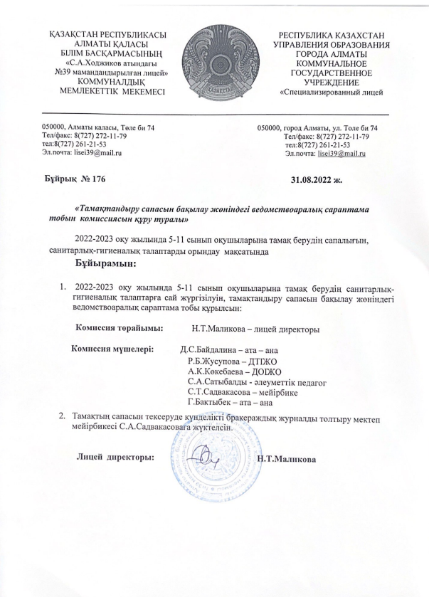 01 қыркүйек 2022 0 1 2 3 4 5 Тамақтандыру сапасын бақылау жөніндегі ведомствоаралық сараптама тобын комиссиясын құру туралы