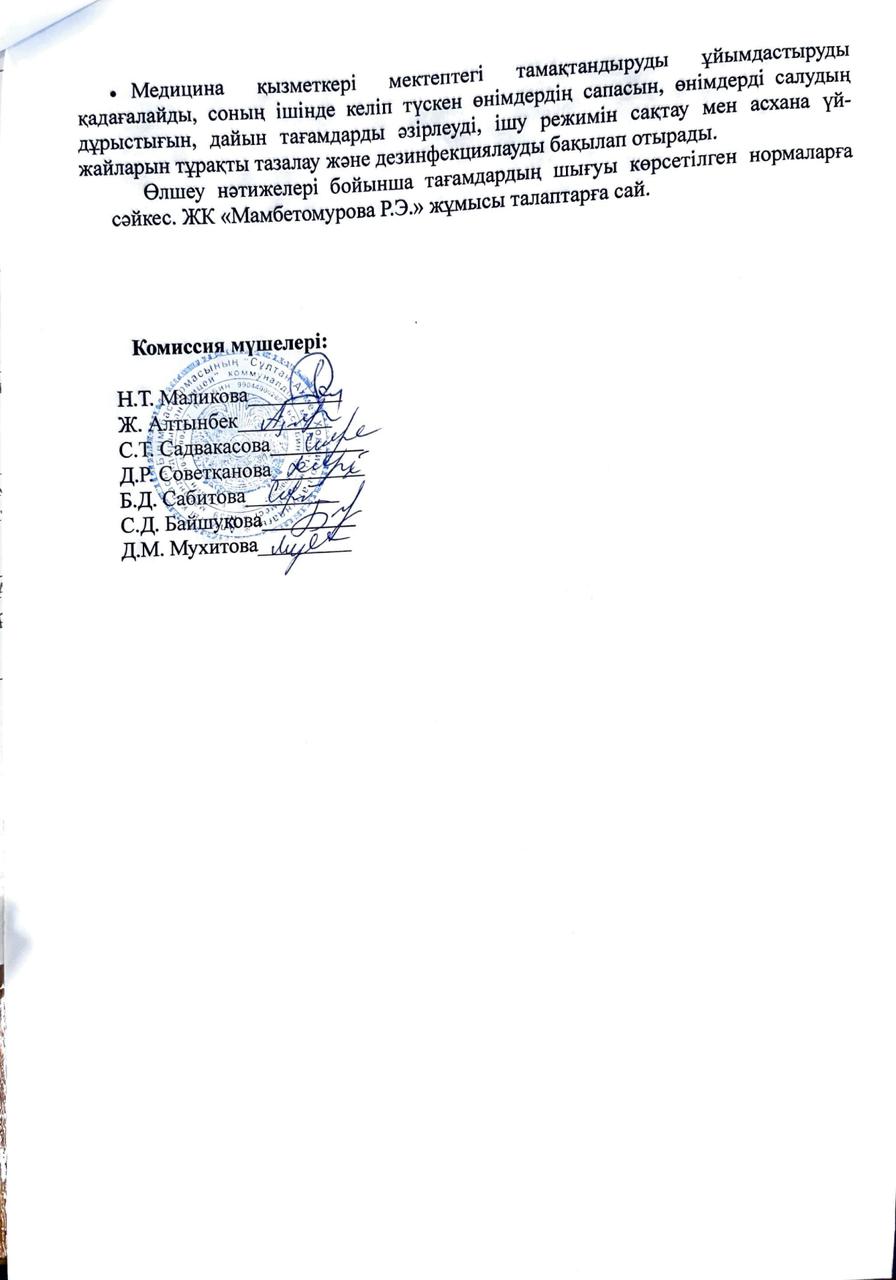 Тамақты ұйымдастыру сапасына мониторинг жүргізу жөніндегі комиссияның анықтамасы